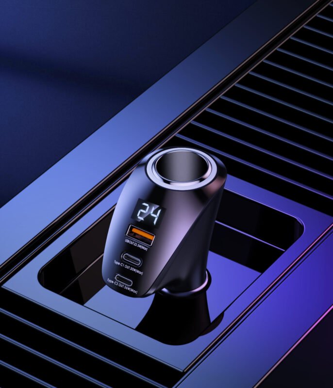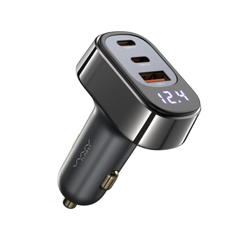 88.5W Fast Charging Car Charger – 3 Port (USB-A + Dual Type-C) with LED Display