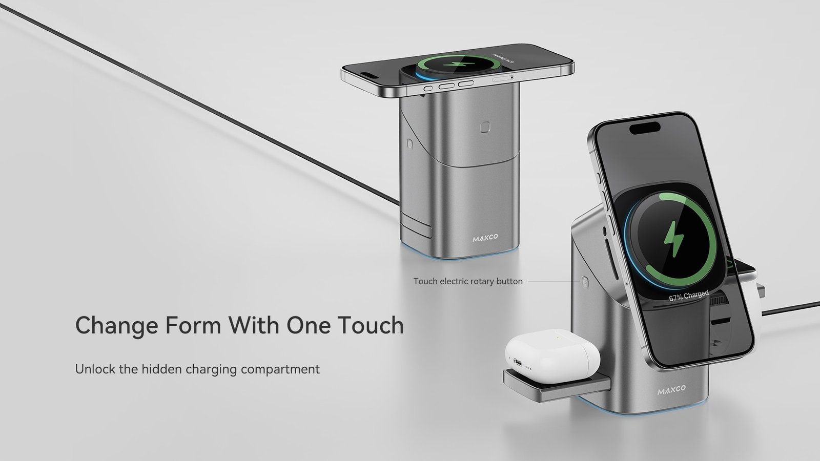 Its powerful magnetic system ensures perfect alignment for your phone, delivering up to 15W fast charging, along with dedicated charging modules for your smartwatch and earbuds.