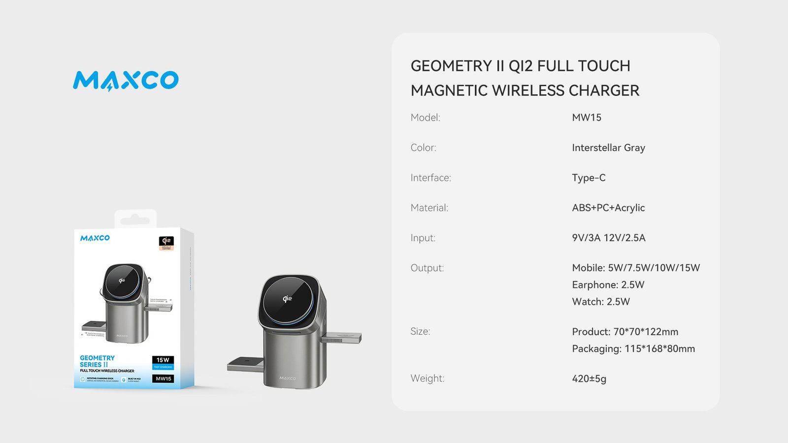 Experience the next generation of wireless charging with the Maxco MW15 Geometry II Magnetic Wireless Charger, built with the latest Qi2 / MagSafe standards for faster, safer, and more stable charging.
